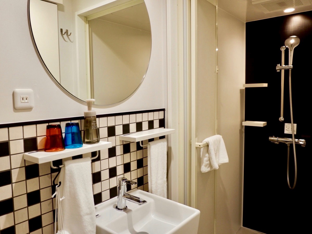 ベッドルームの隣には、トイレと洗面台、シャワーブースを設置。浴槽はついていませんが、汗をさっと流して身だしなみを整えるくらいなら充分な設備です。