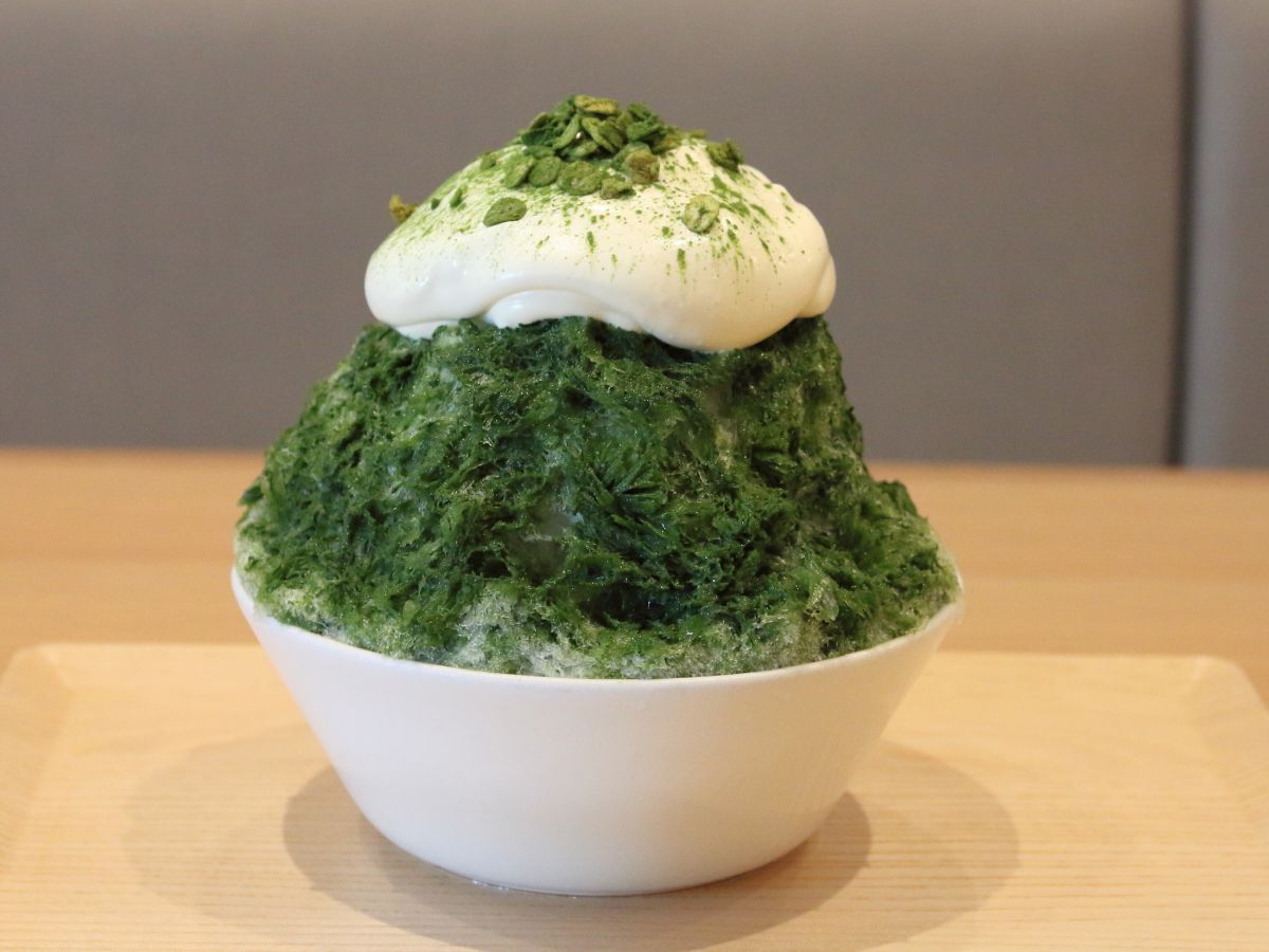 あまおうイチゴミルク、八女抹茶、おいしいきなこ、などの定番メニューに加え、創作メニューもありますよ。こちらは、平日限定の「抹茶マスカルポーネ(800円)」。