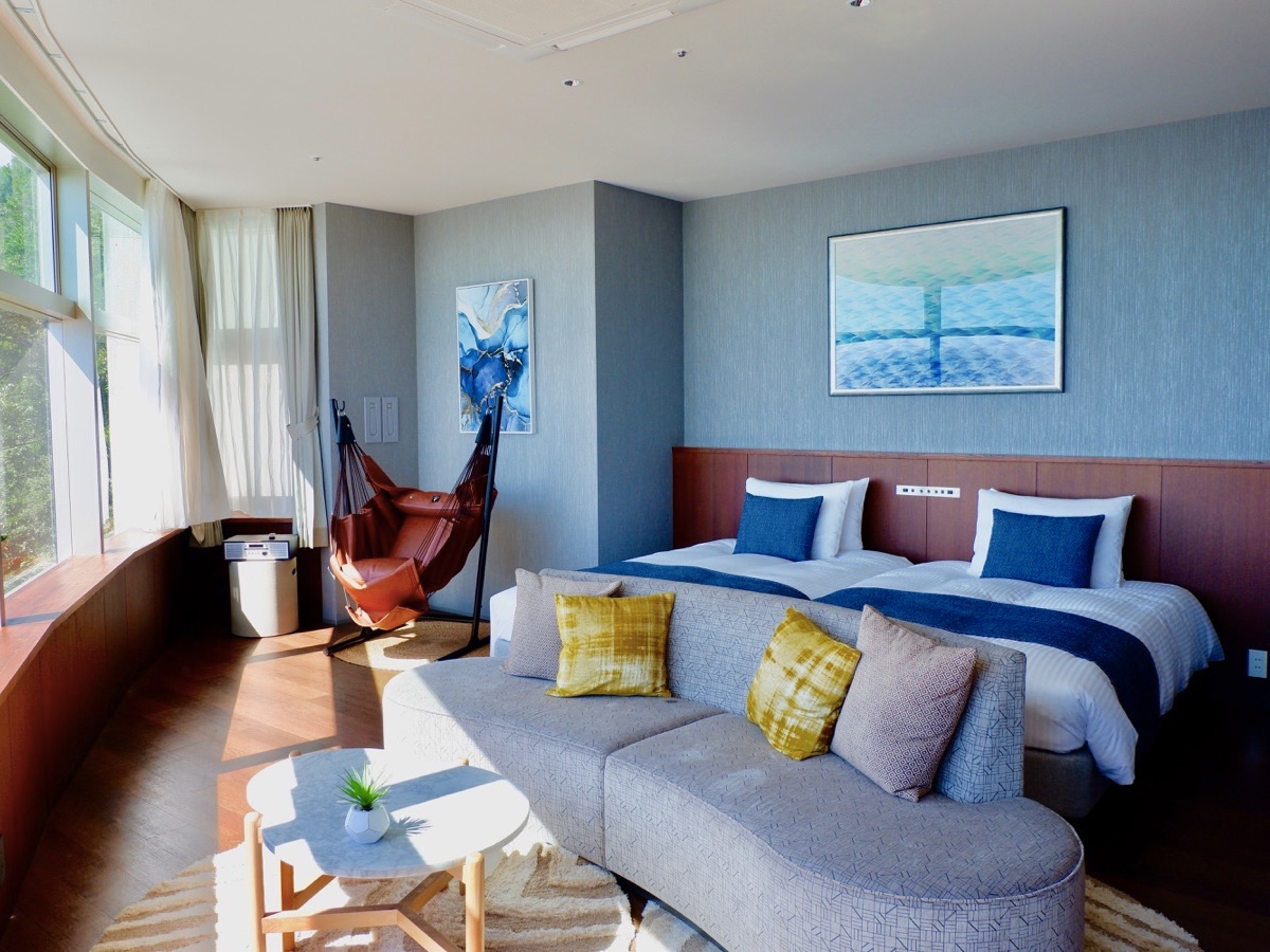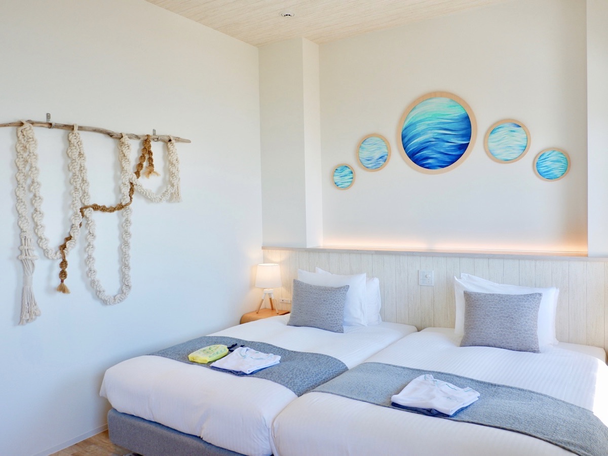 白を基調としたかわいい客室「オーシャンスーペリア」も人気。水面をイメージしたアートや流木のオブジェなど、葉山で活躍するアーティストの作品も飾られています。