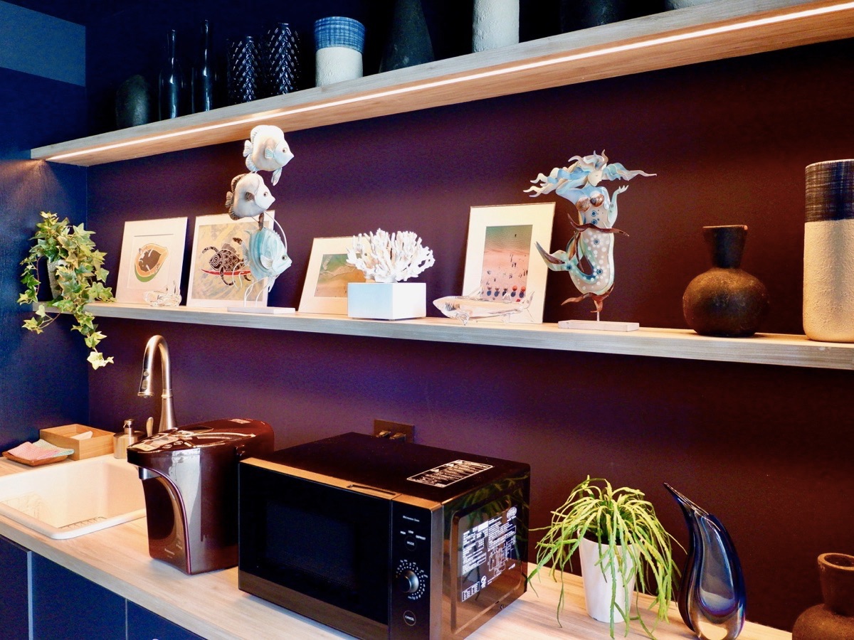 海をイメージしたオブジェやアートが飾られた共用スペースには、流し台の隣に電子レンジ、電子ポッドも用意されています。