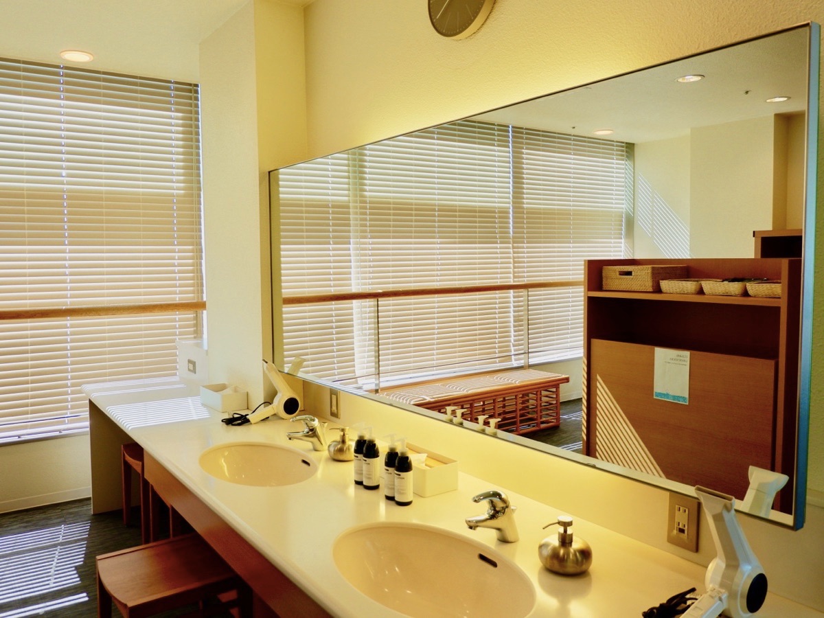 脱衣所の洗面台には基礎化粧品やティッシュ、ドライヤーなど各種アメニティがそろっています。