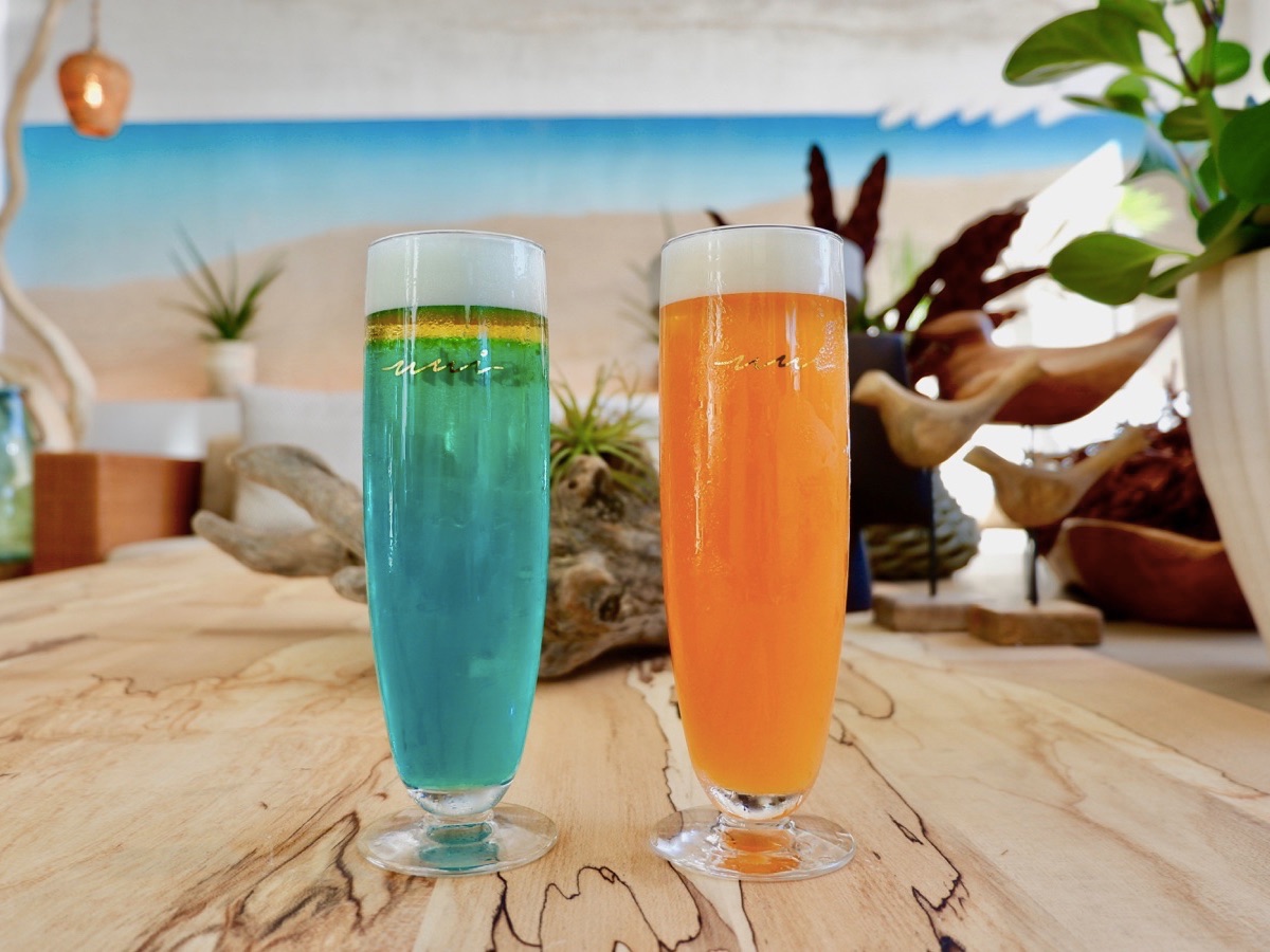 エメラルドの海を思わせる「ブルーオーシャンビア」(700円)は、トニックウォーターとブルーキュラソーが効いたさわやかな味わい。