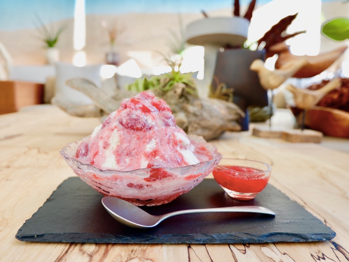 スイーツで注目したいのは「いちごミルクかき氷」(900円)。パウダースノーのようなふわふわ食感のミルク氷にいちごの果肉とソースがかかっていて、濃厚な味わいを楽しめます。
