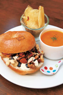 生ハムトマトなど多彩なベーグルサンドは250円~。ベーグルサンドセット600円~は11~15時限定のセットで、スープとポテトが付きます。店の奥にイートインスペースがあり、ソファ席でくつろぐこともできます。