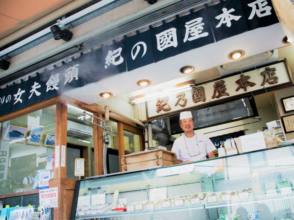 江の島の参道にある、200年以上の歴史をもつ「紀の国屋本店」。創業はなんと江戸時代後期。元々は旅籠だったそうですが、先々代がまんじゅうづくりをはじめたことで、現在のスタイルになったそうです。