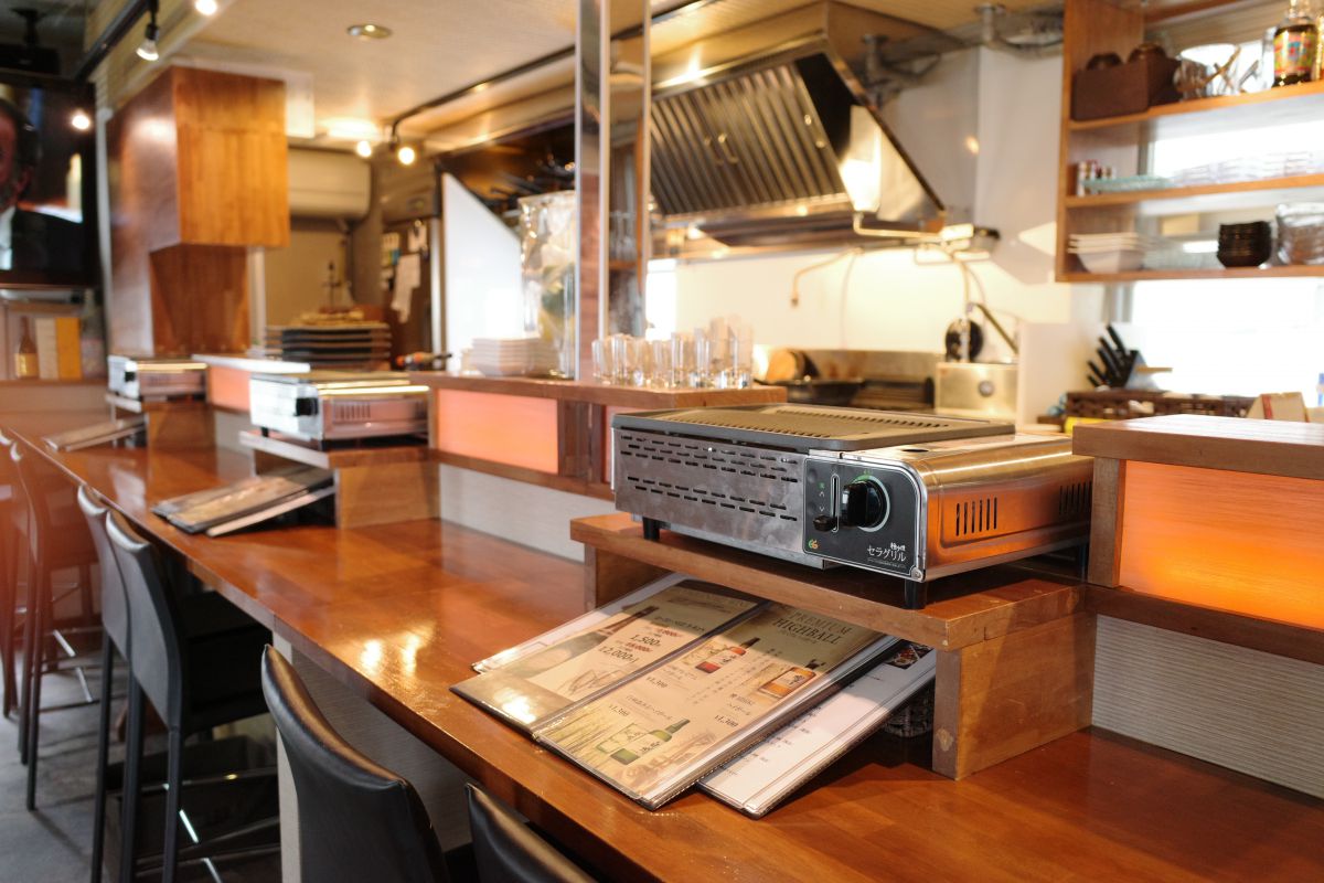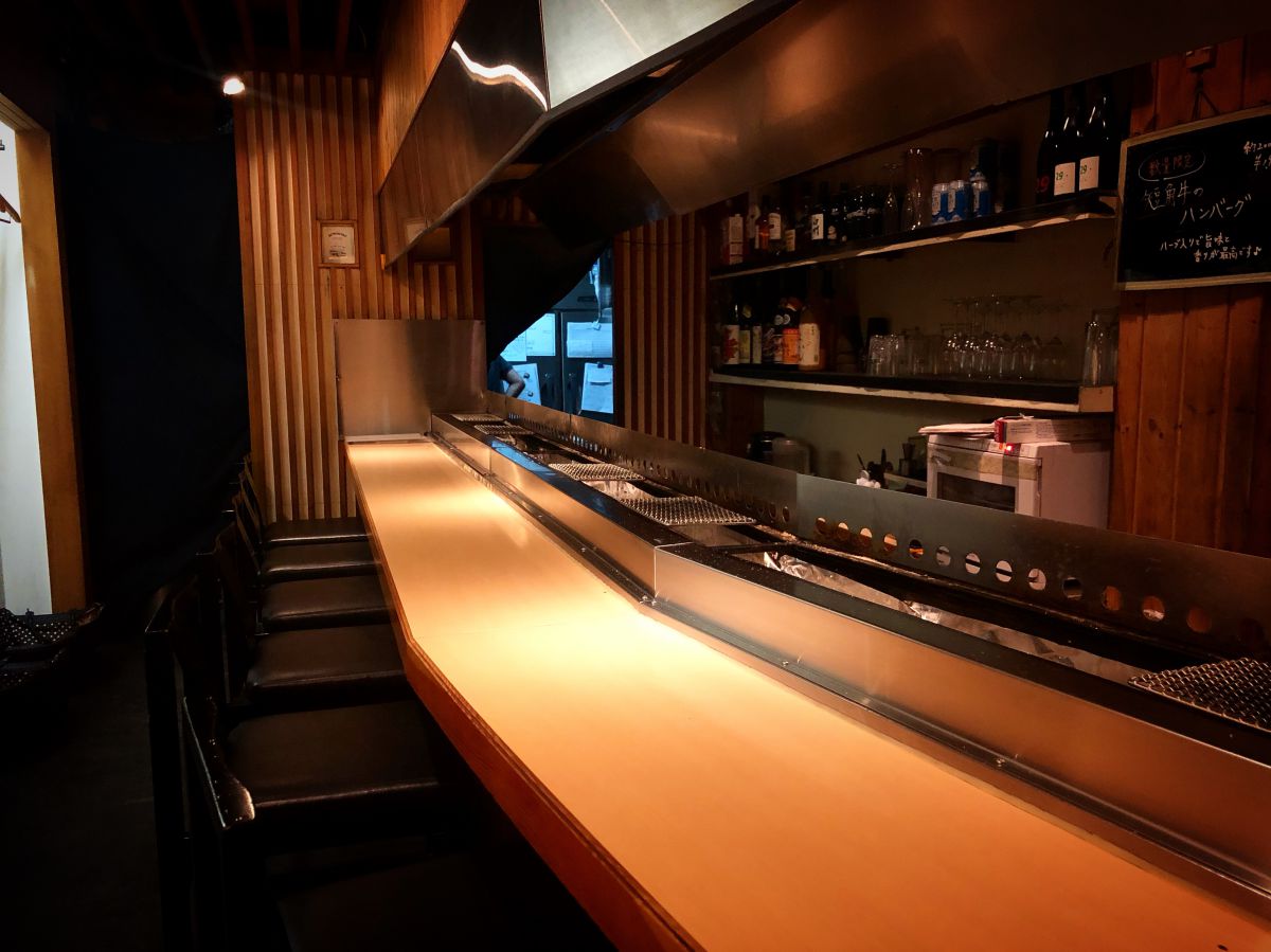 細長い店内は4人掛けのテーブルが2つある以外、全てカウンター席になっています。カウンター席には横長に焼き台が設置されており、ひとりでも炭火で存分に焼肉を楽しめます。