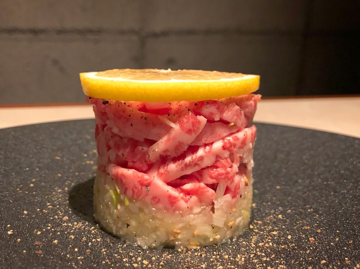 「極上塩ユッケ」(税抜1900円)は、ネギみじん、生肉、レモンと3層仕立てになっており、見た目からもおいしさが伝わってきます。