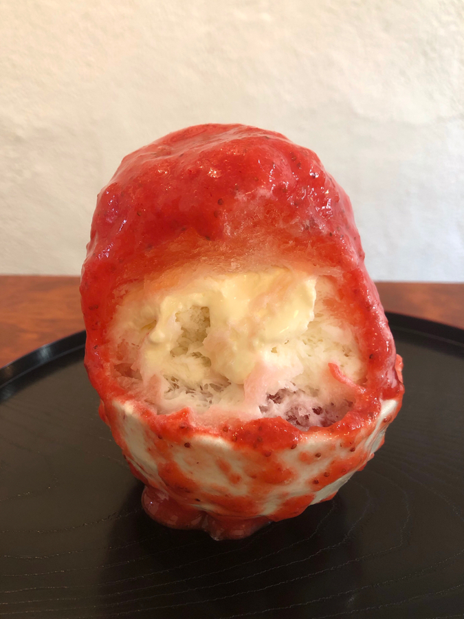 こちらは「極いちごみるく」の小サイズ。なんだかだるまさんみたい。真っ赤ないちごが氷を包み込んでいて鮮やかです。練乳をかけながらどうぞ。