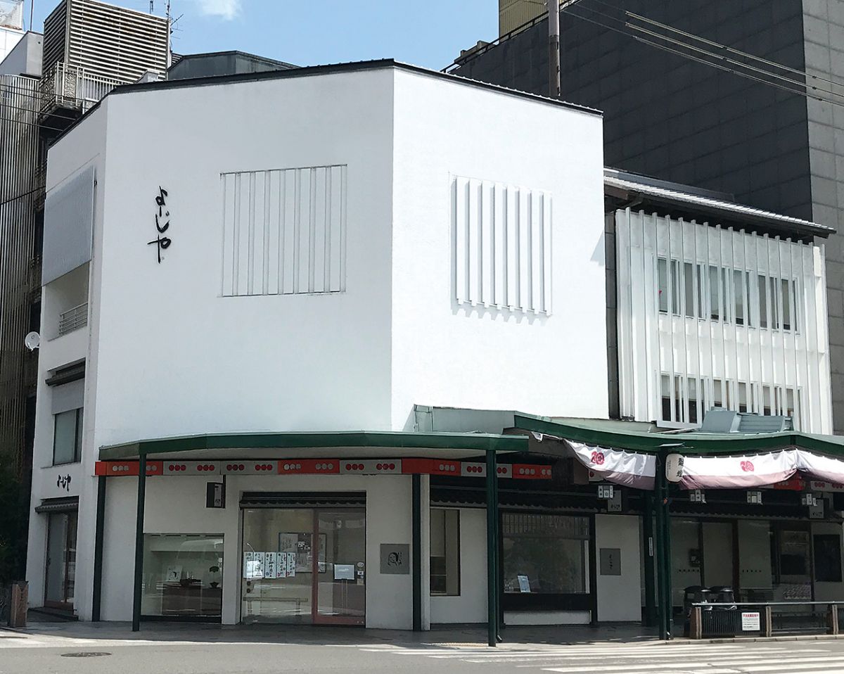 八坂神社参道としての役割も果たす祇園商店街は、四条通りに沿って鴨川横の川端通りまでに立ち並ぶ商店街。商店街のある四条通を歩いて、花見小路通との交差点にある大きな真っ白いビルが「よーじや衹園店」です。