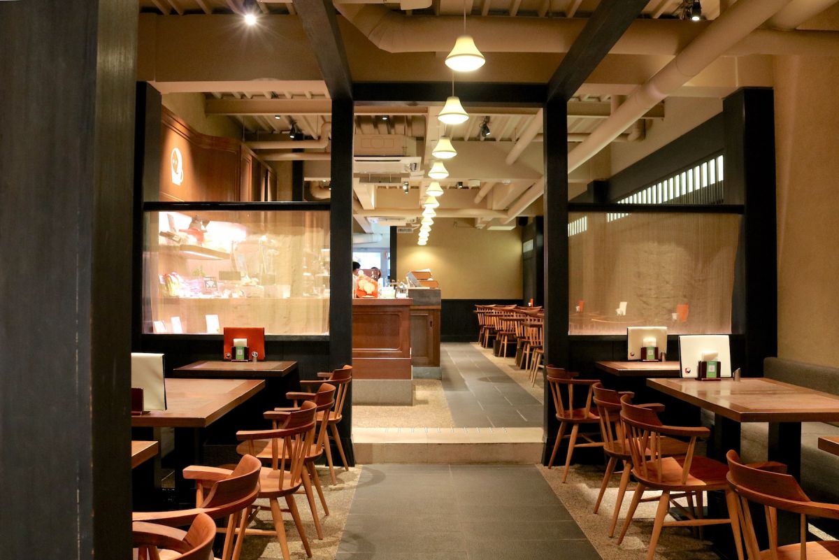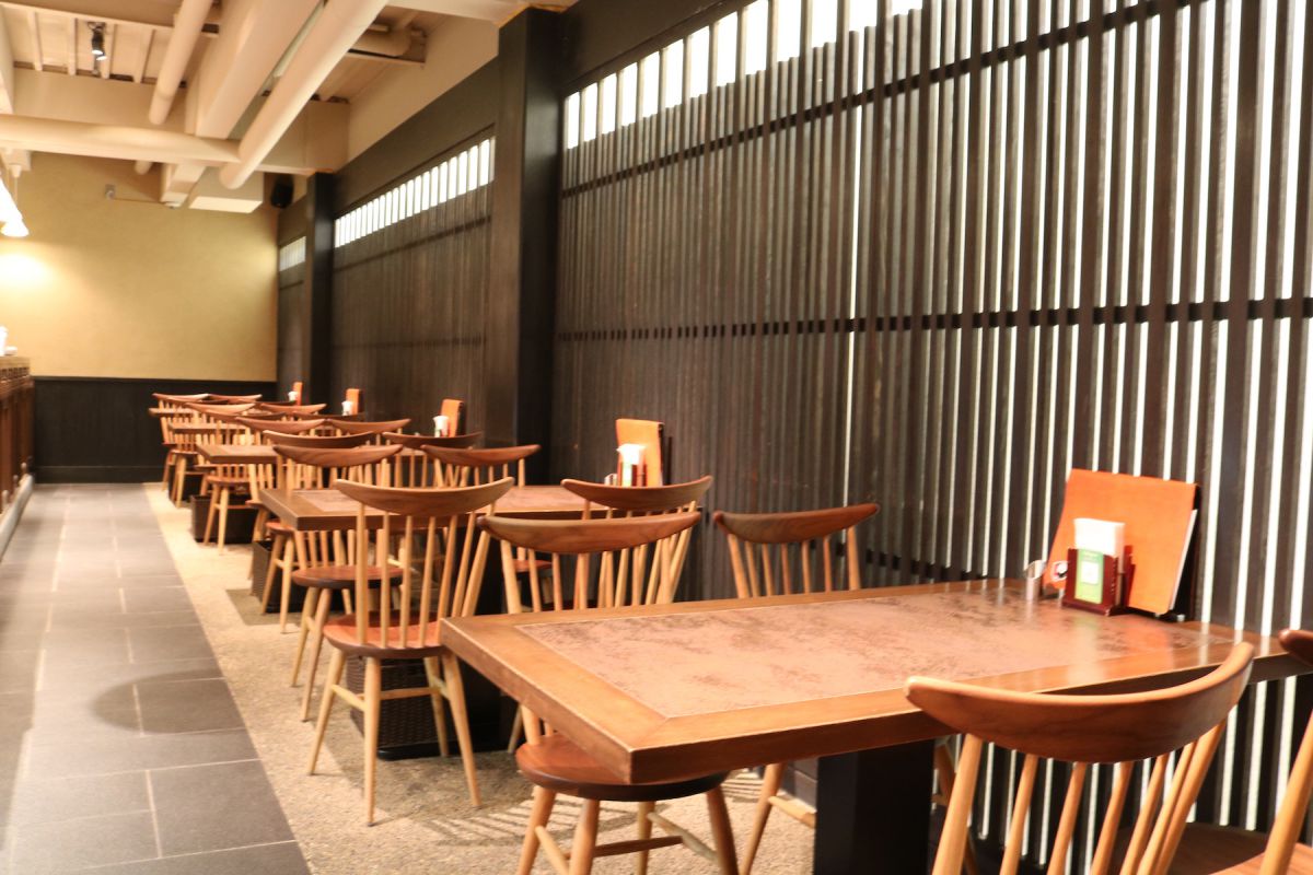 ゆったりととられた席、石畳のような床、格子戸を模した壁などが落ち着いた雰囲気を醸し出し、ビルの中ということを忘れるほど落ち着ける空間です。