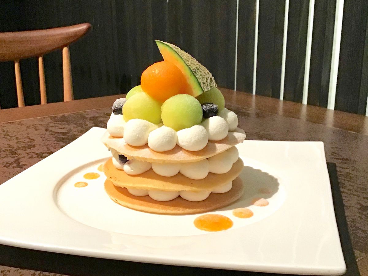 例えば、こちらは7月に行われたメロンフェア。衹園店では、衹園店限定メロンのホットケーキが提供されました。くりぬいたメロンの丸とホイップの丸、ホットケーキの丸とたくさんの丸で構成されたホットケーキは、食べるのが惜しくなるくらいのかわいさです。どのメニューもパティシエとの共同開発で、見た目も味も間違いなし。