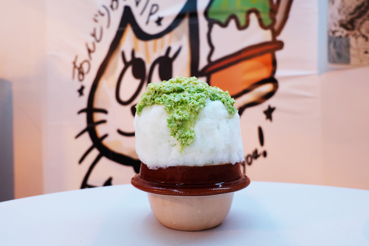 代々伝わる自家製の磯辺餅のタレをベースにした甘塩っぱいエスプーマが氷を覆います。氷や団子をエスプーマと絡めて食べれば、まるで冷たいみたらし団子を食べているかのような感覚に。