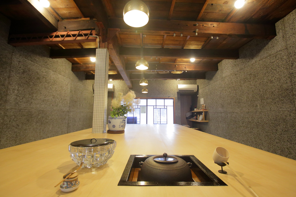 シンプルでクールな外観に負けず劣らず、店内は直線美を感じる静謐な空間になっています。なんとこちらは築100年の長屋をリノベーションしたんだそう。センターに大きなテーブルが1卓のみあり、必然的に相席となります。たまたま居合わせたお客さん同士、話しが弾むことも。