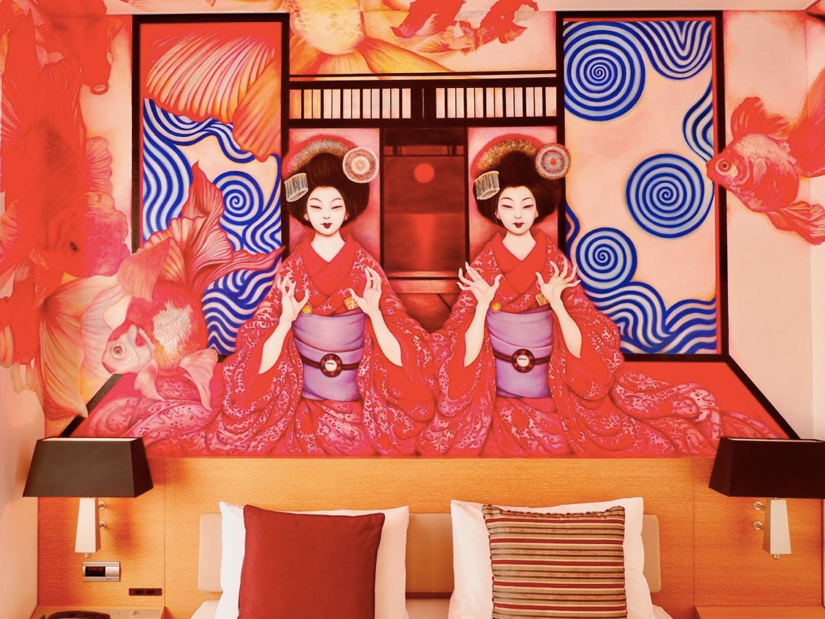写真の客室は画家・成田朱希さんが手がけたアーティストルーム「芸者金魚」。ベッドサイドに描かれているのは2人の美しい芸妓。客室全体に金魚が泳いでいるかのような幻想的な空間が広がります。