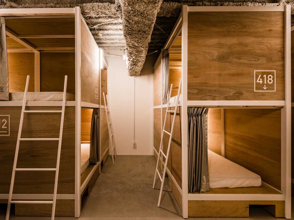 写真はこのホステルの120部屋を占める「バンクベッド」という2段ベッドです。宿泊料金は1人1泊3000円~(無料セキュリティロッカー付き)とは、カプセルホテルより安い!? 肝心のベッドは清潔感があってふかふか。