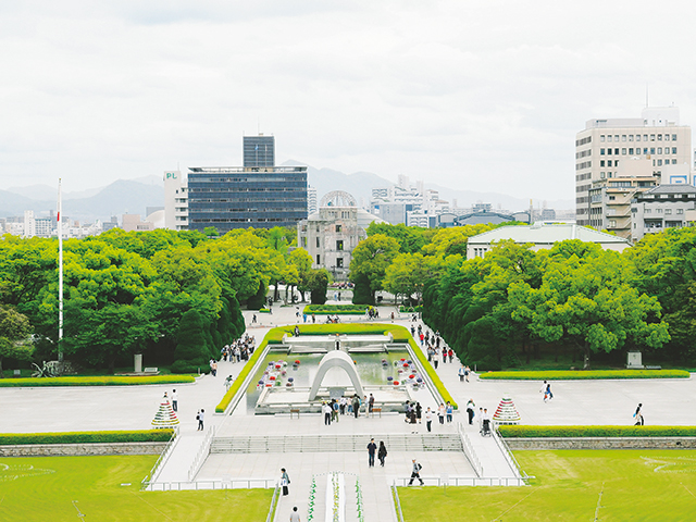 周囲を川に囲まれた公園は広々として、園内には原爆ドーム、広島平和記念資料館、平和を祈る数々のモニュメントなどがあります。各施設を見学するのはもちろん、園内に点在する「平和の鐘」や「原爆の子の像」などモニュメントをめぐりながら散策するのもおすすめです。