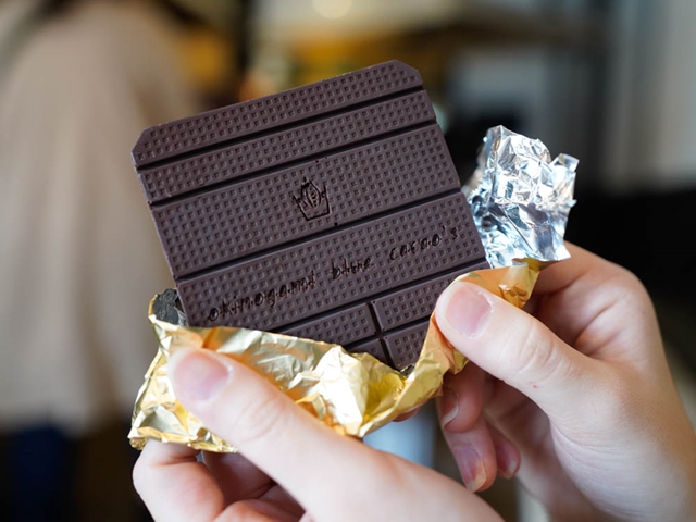 買い物に疲れたら、ここでひと休み。チョコレート工場にカフェが併設された、おしゃれなスポットに立ち寄ってみましょう。おすすめは、カカオの風味とミルクティーがミックスされた「ロイヤルカカオミルクティー」。ほろ苦い口あたりは、甘さが苦手な人にもおすすめです。こだわりのカカオ豆から作られたチョコレートで元気も回復。ギフトにするのも良さそうです。