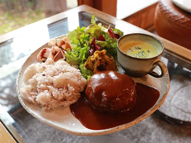 点在する町屋や古民家に、こんなステキなカフェが隠れているのが城下町のステキなところ。築70年ほどの家屋がリニューアルされた一方で、中にはレトロな家具が残っていたり、広々とした日本庭園があったりと、和風モダンな雰囲気がたっぷりです。お昼にいただけるのは、雑穀米と地産地消のおかずを合わせたランチプレートなどのこだわりメニュー。庭を眺めながら、のんびりしたランチタイムを過ごせます。