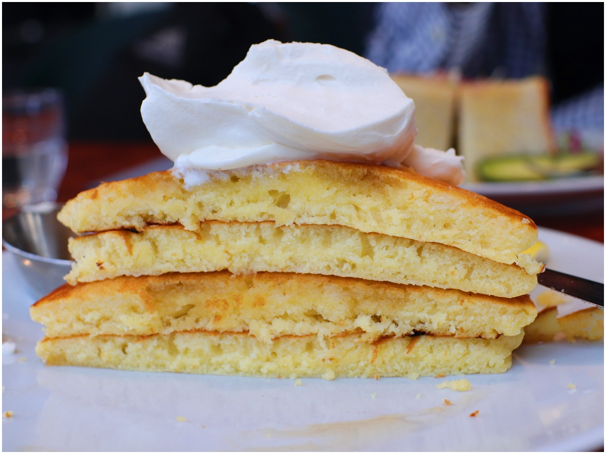 バターミルクのパンケーキはふわふわ。クリームをのせて食べましょう。