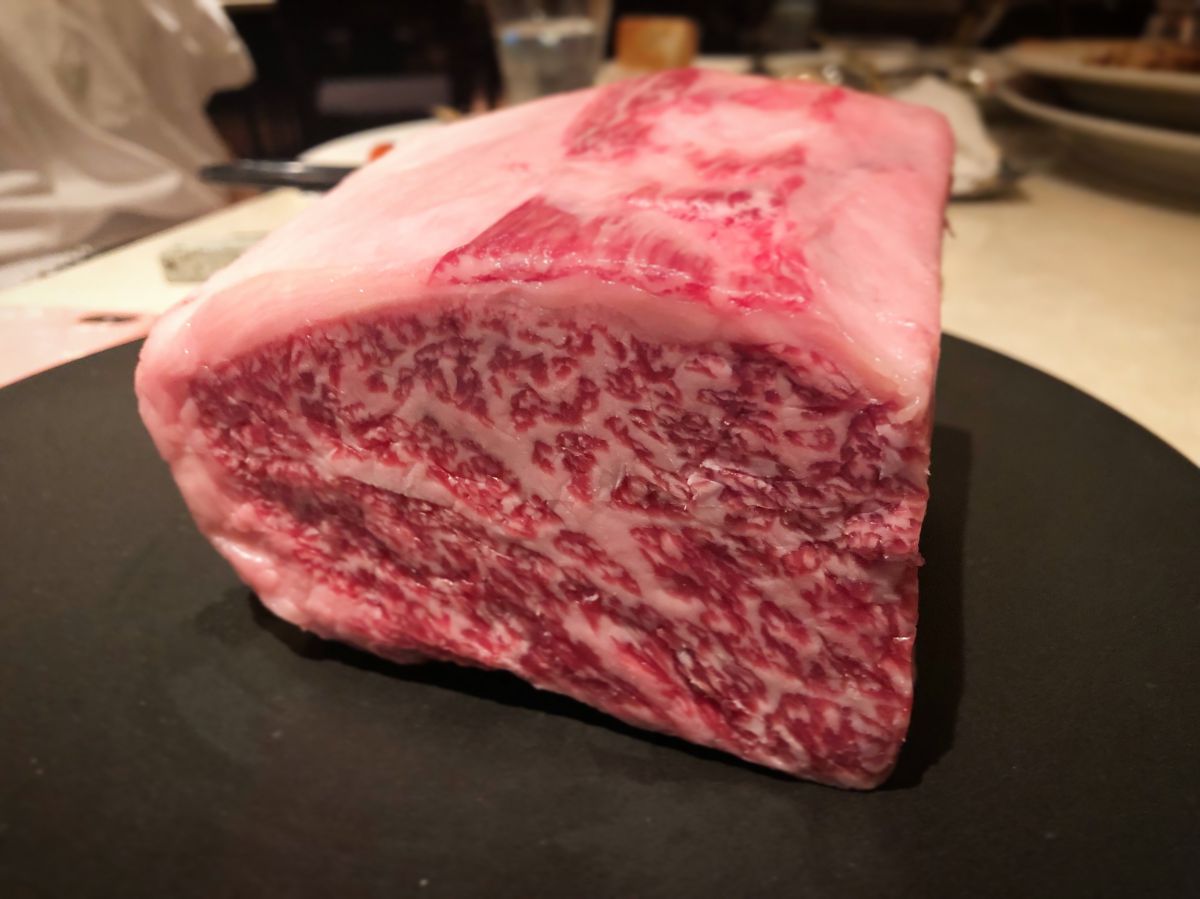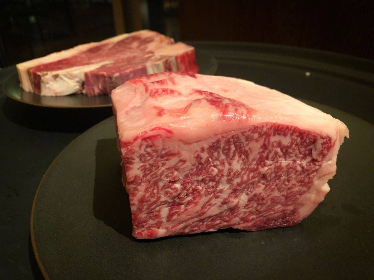 島根県産のアンガス牛と黒毛和牛の掛け合わせた大国牛と、兵庫県産の但馬玄(マグロのように脂の融点が低いことから但馬玄人/タジマグロと名付けられたそう)が並ぶと圧巻!