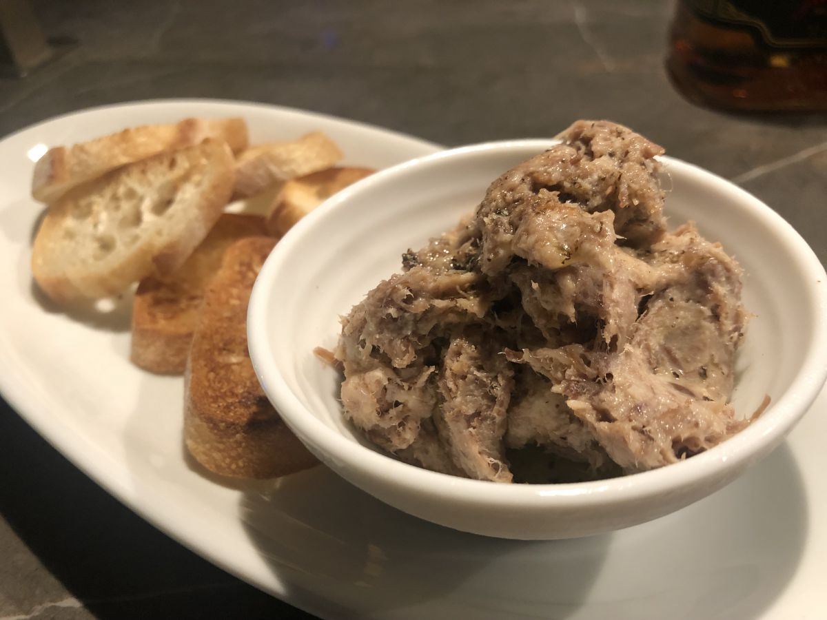 前菜の「牛肉のリエット」はバケットに載せて。粗めで肉々しい仕上がりになっています。
