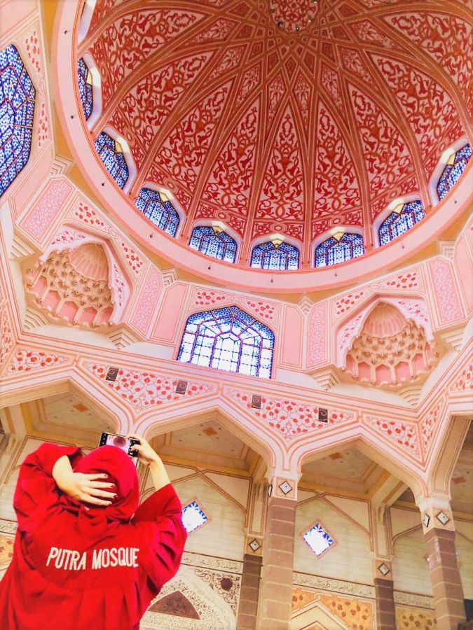 女性は入場時にローブを無料で貸し出してもらえるのですが、このローブもピンク色でかわいいんです!背中には「PUTRA MOSQUE(プトラモスク)」の文字も入っているので、カメラに背中を向けて写真を撮るのもおすすめです。