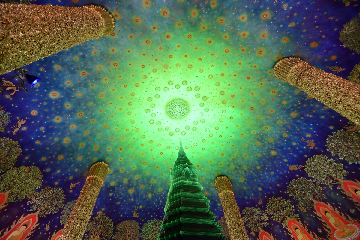 今、タイのバンコクで人気上昇中のお寺。人気の秘密は真っ白な仏塔の最上階(5階)にある、緑のガラス塔と宇宙空間のような天井画!仏塔ならではの、静かで神秘的な雰囲気を味わうことができることも魅力のひとつです。