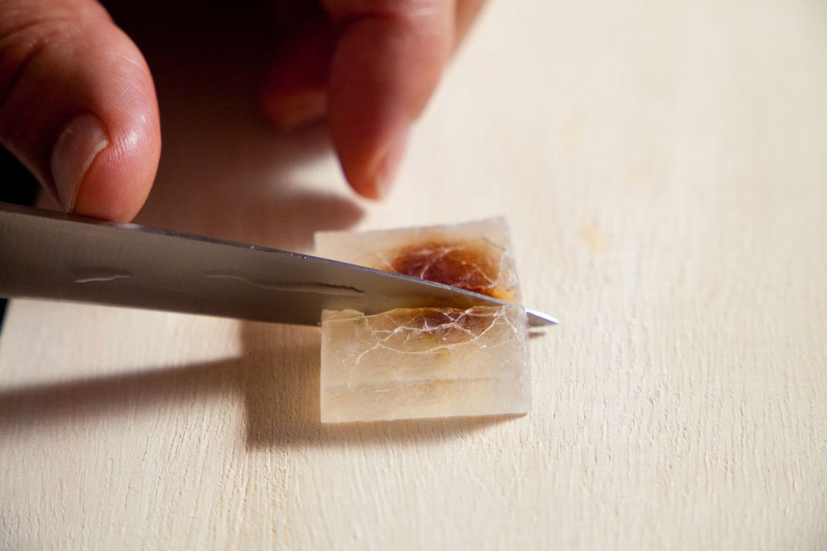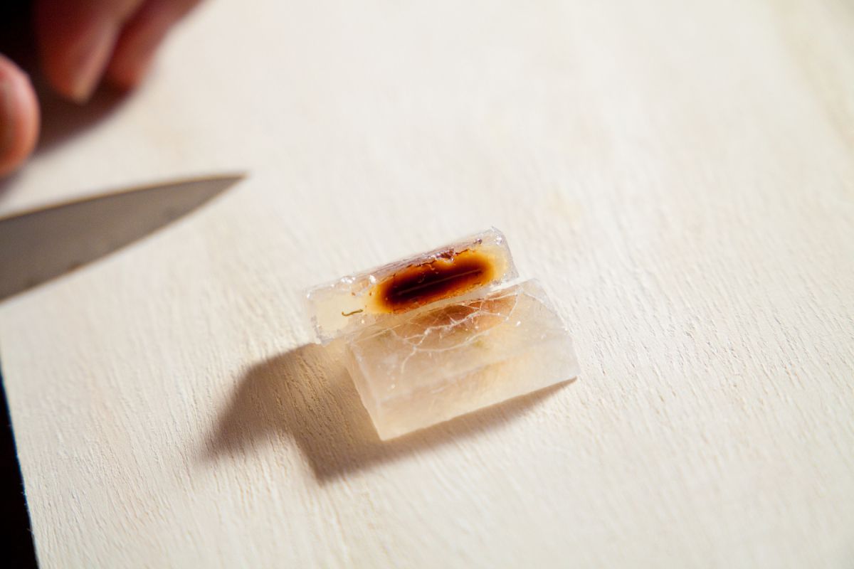 たどり着いたのは、日本の和菓子、琥珀糖。刃を入れると薄氷がパリッと割れるように細かなヒビが入ります。中に入っている素材が独特で、こちらはバルサミコ酢とハーブ(タイム)。ほかに実山椒、赤シソ、日本酒とチョコレートなど思いがけない味が口に広がります。