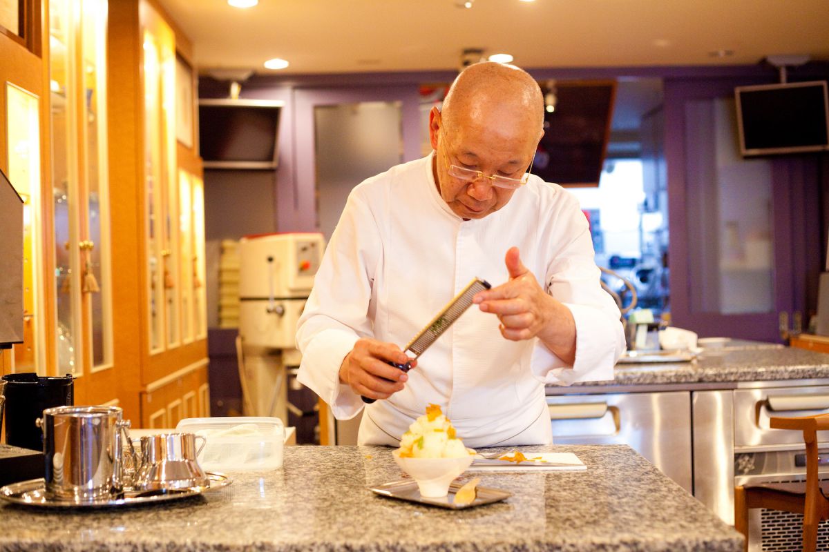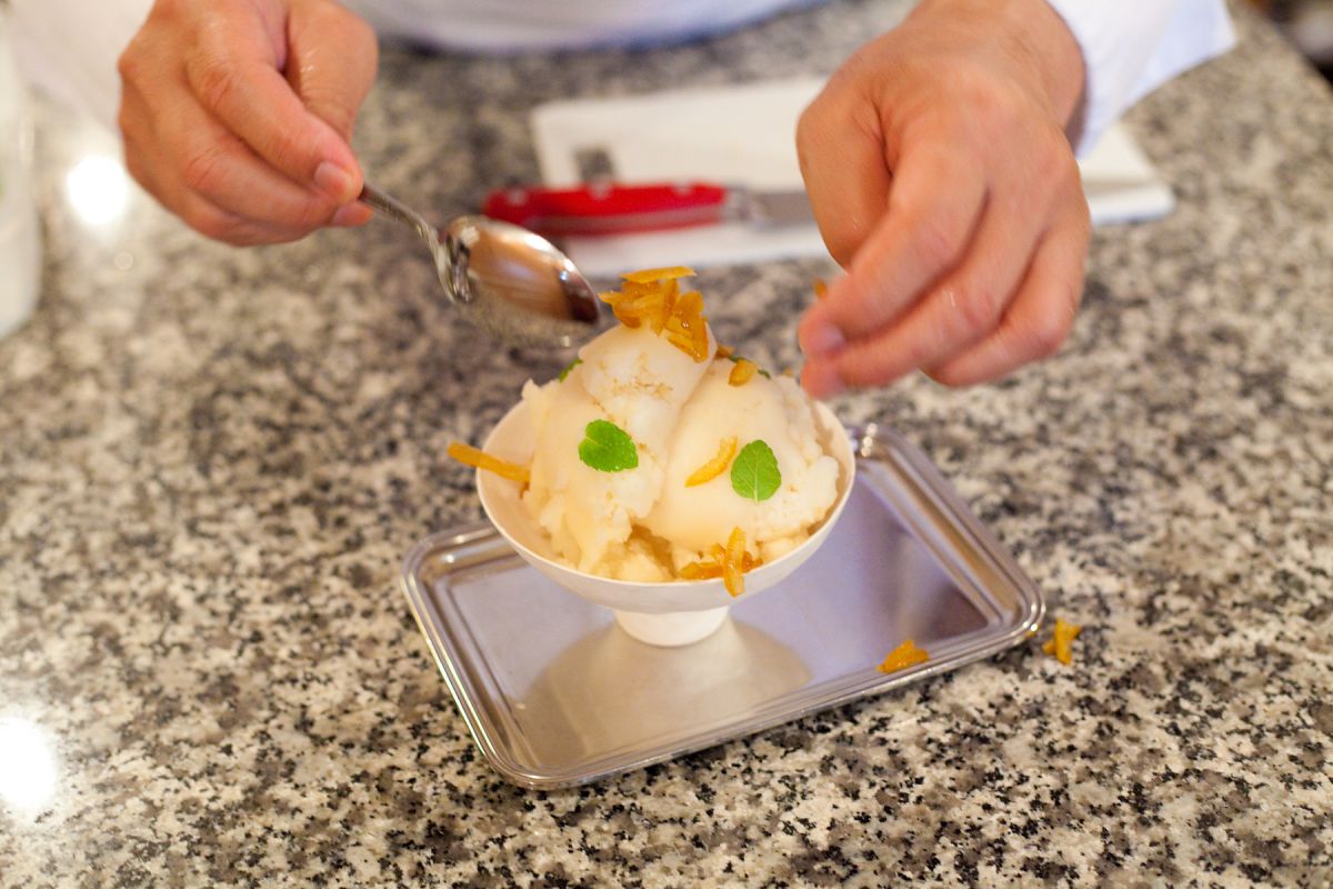 仕上げに柚子の皮を削りかけますが、その仕上げも独特。プレートまで散らすようにかけていきます。添えられた木のスプーンも、一口目に乾いた木の舌触りがないように、シロップを薄めた液に浸してから添えられます。