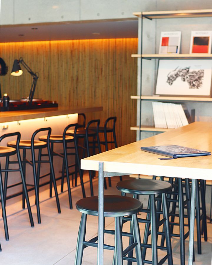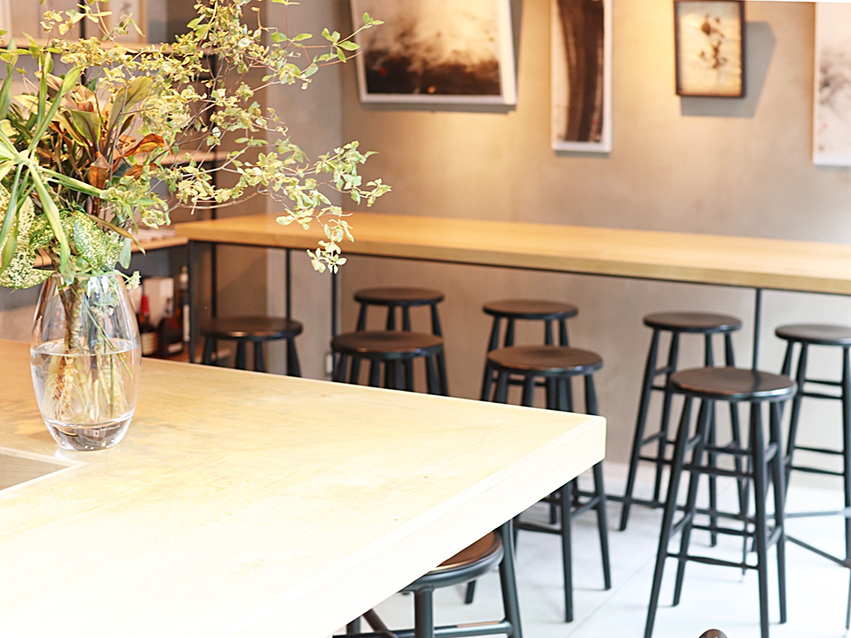 無機質そうに見える店内ですが、木のテーブルや竹のような壁が和モダンな温かみを演出しています。