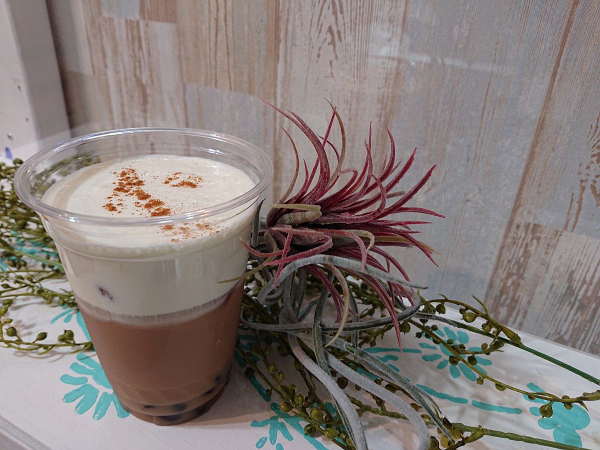 お店のイチオシは、チーズチャイティータピオカ(600円)。話題のチーズティータピオカをなんとインド式マサラチャイで再現!サラチャイは、数種類のスパイスとチャイの為の茶葉 アッサムCTCを煮込んだかなり本格的なもの。そのマサラチャイをクリームチーズフォームでキャップしタピオカをトッピングした、ちょっと変わったチーズチャイティータピオカなんです。