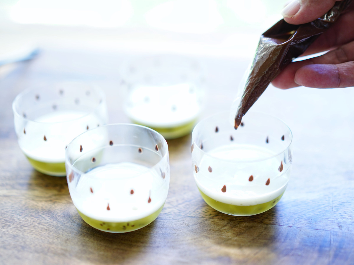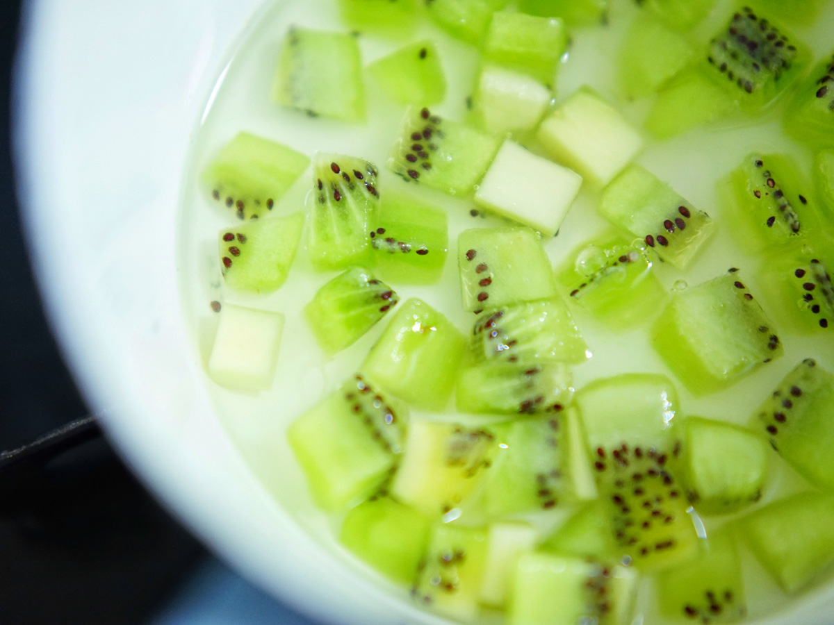 同様にミルクゼリーも作り、キウイゼリーが固まったところに流し込みます。