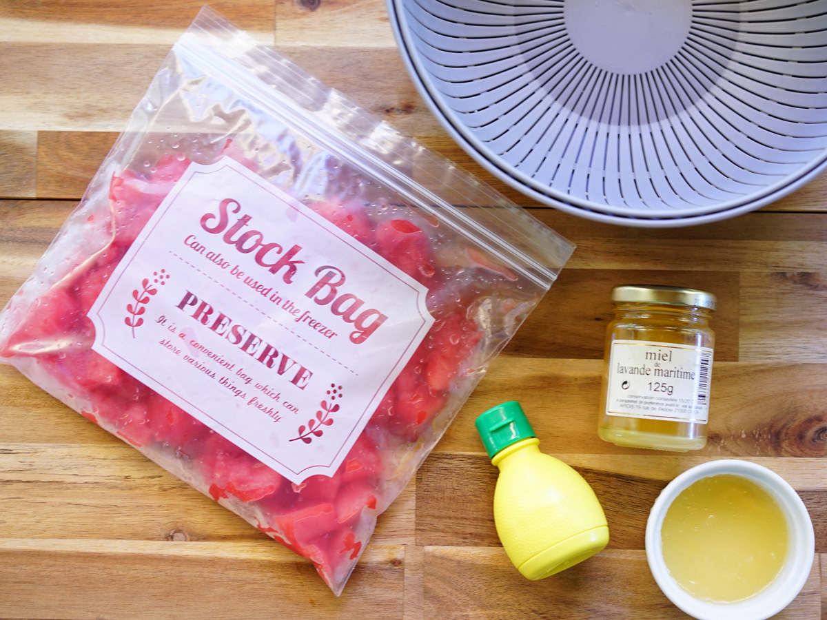 すいかゼリー用のすいかを、密封できる袋に入れ、上からつぶします。その後、ざるなどで漉して、400gを取り分けます。