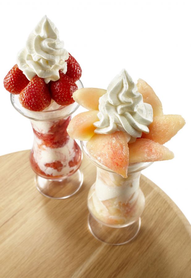 今回登場するメニューは酒粕、栗、柑橘など全8種。その中から、おすすめの2つをご紹介。「真夏のW夏いちご」1400円(左)は各日限定100杯。