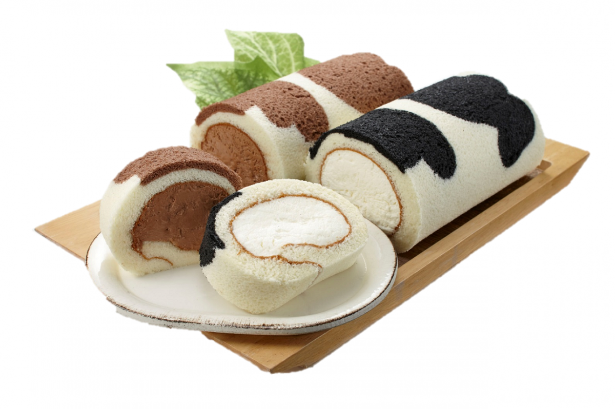 和歌山『黒沢牧場』は、「ジャージーチョコロール」(左)と「ミルクロール」(右)各1620 円。牛柄がかわいいですね。