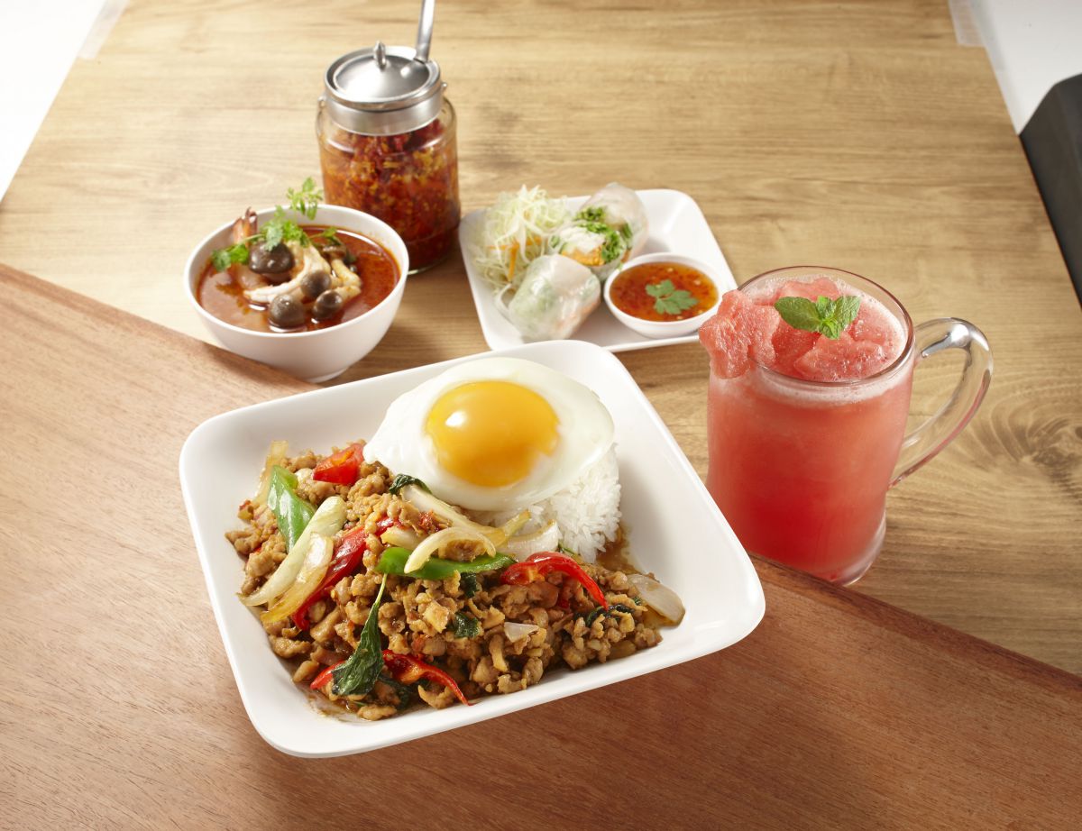 『タイ国屋台式料理スパイスMARKET』は、ガパオと生春巻き、トムヤムミニが付いた「辛旨ガパオ定食」1430円と、スイカジュース600円はいかが。