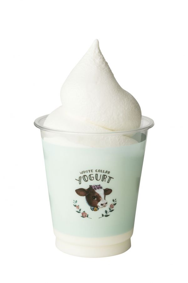 SNSで“もこもこソフト”で話題の東京『ホワイトカラーヨーグルト』は初出店。生乳100%の濃厚ヨーグルトに、ミルクソフトがのった「ヨーグルトソフトパフェ」 630 円は、カップのイラストもかわいいです。