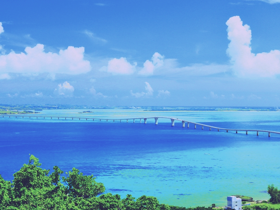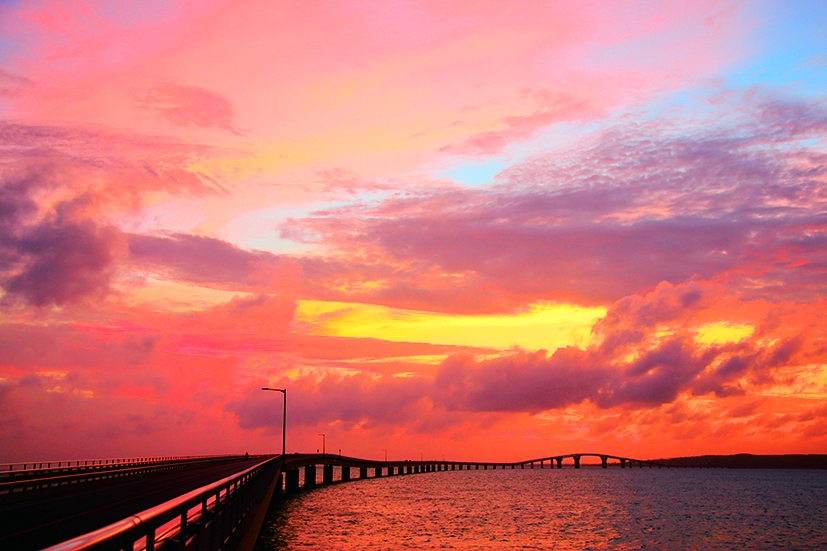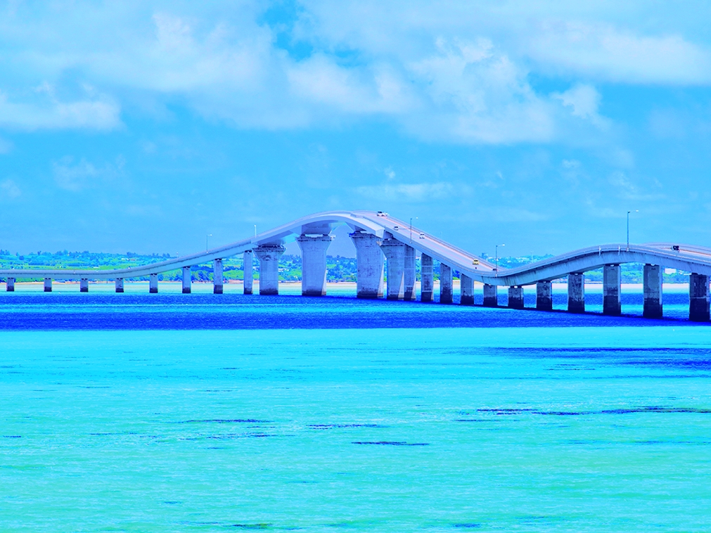 「伊良部大橋(いらぶおおはし)」は、宮古島と伊良部島を結ぶ全長3540mの橋。起点となる宮古島の久貝地区から、伊良部島東南部の道路を含めると、その長さは6500mにもなり、通行無料の橋としては国内最長なんです!