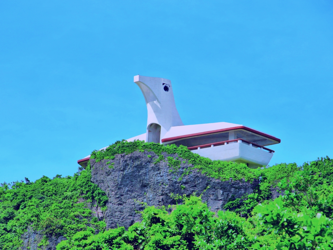 「牧山展望台」は、伊良部大橋からほど近い牧山公園内にあり、島に飛来する渡り鳥・サシバをモチーフにした造りがユニーク。