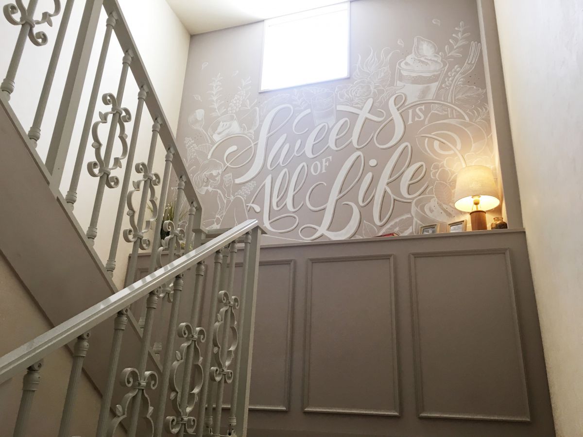 階段の踊り場を見上げると、素敵なウォールアートを発見。これはイラストレーターの諌山直矢氏が3日通って直接壁にペイントして仕上げた作品なのだそう。