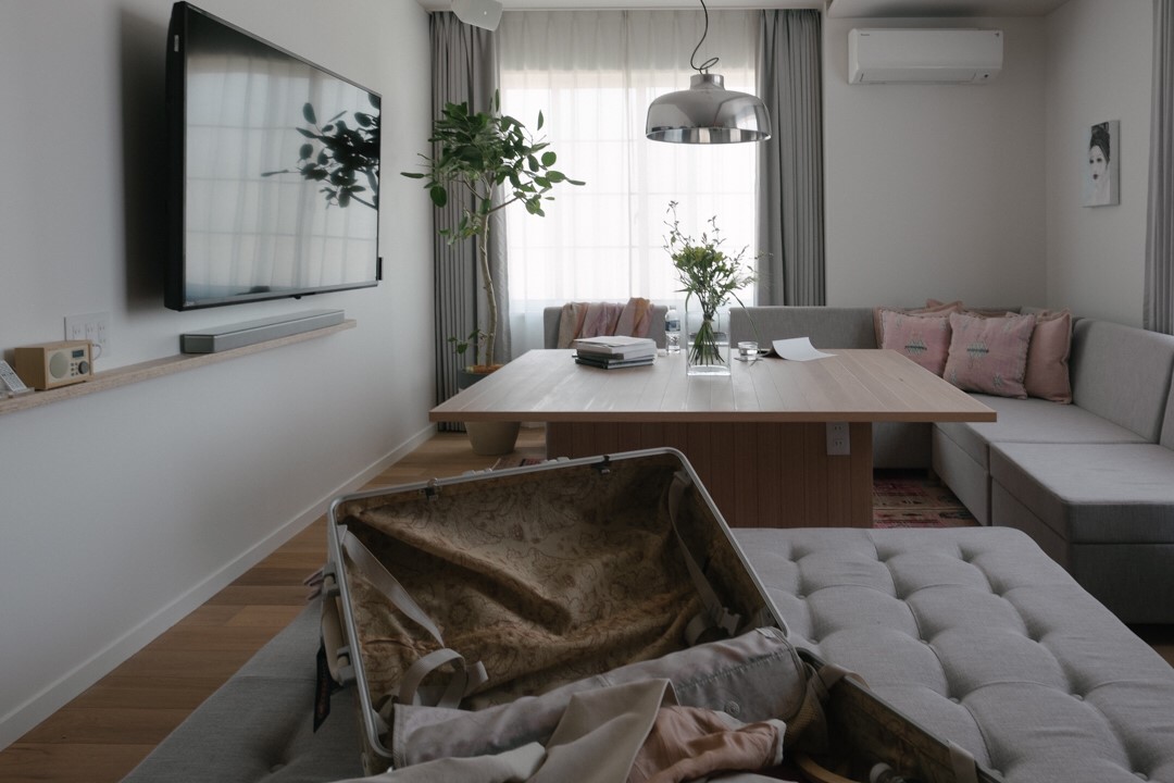 リビングには、タブレットと連動してカラオケや動画が楽しめるハイビジョンモニター、キングサイズのベッドと見紛うような広いソファなどが配されます。