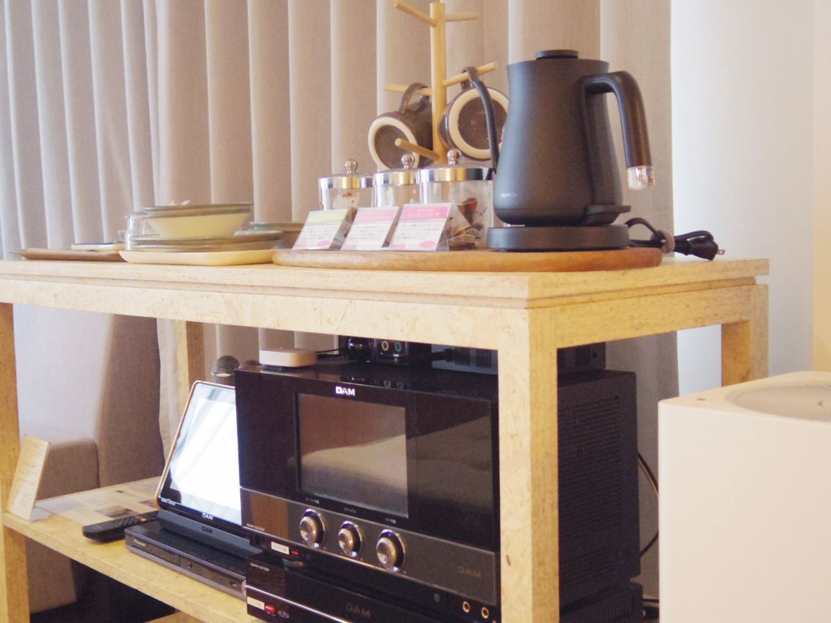 備品として設置される空気清浄機や電気ケトルには、上質なデザインと高い機能性で知られるバルミューダを採用。