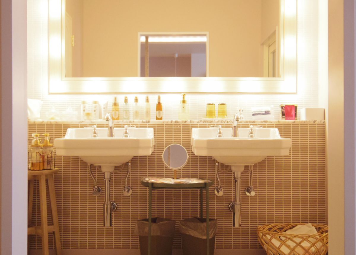 脱衣所には、メイクが楽しくなる広いハリウッドミラー。シートマスクや足指パッド、コンタクト保存液もある贅沢な内容のアメニティセットやガウンも人数分用意されています。