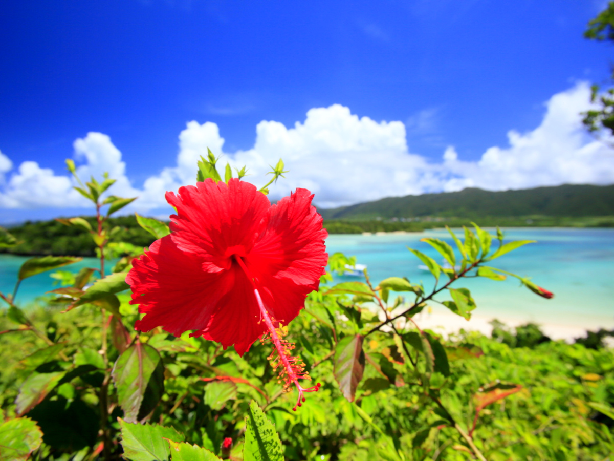 青い海を背景に、真っ赤なハイビスカスが絵になりますね。
