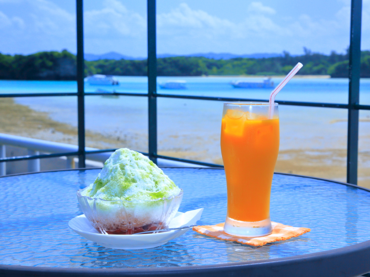 写真は、「マンゴージュース」500円と、「沖縄風抹茶ぜんざい」650円。そのほか、「カビラブルー・ソーダフロート」750円や「八重山そば」700円 などの軽食もおすすめです。「琉球真珠」のショップに隣接しています。