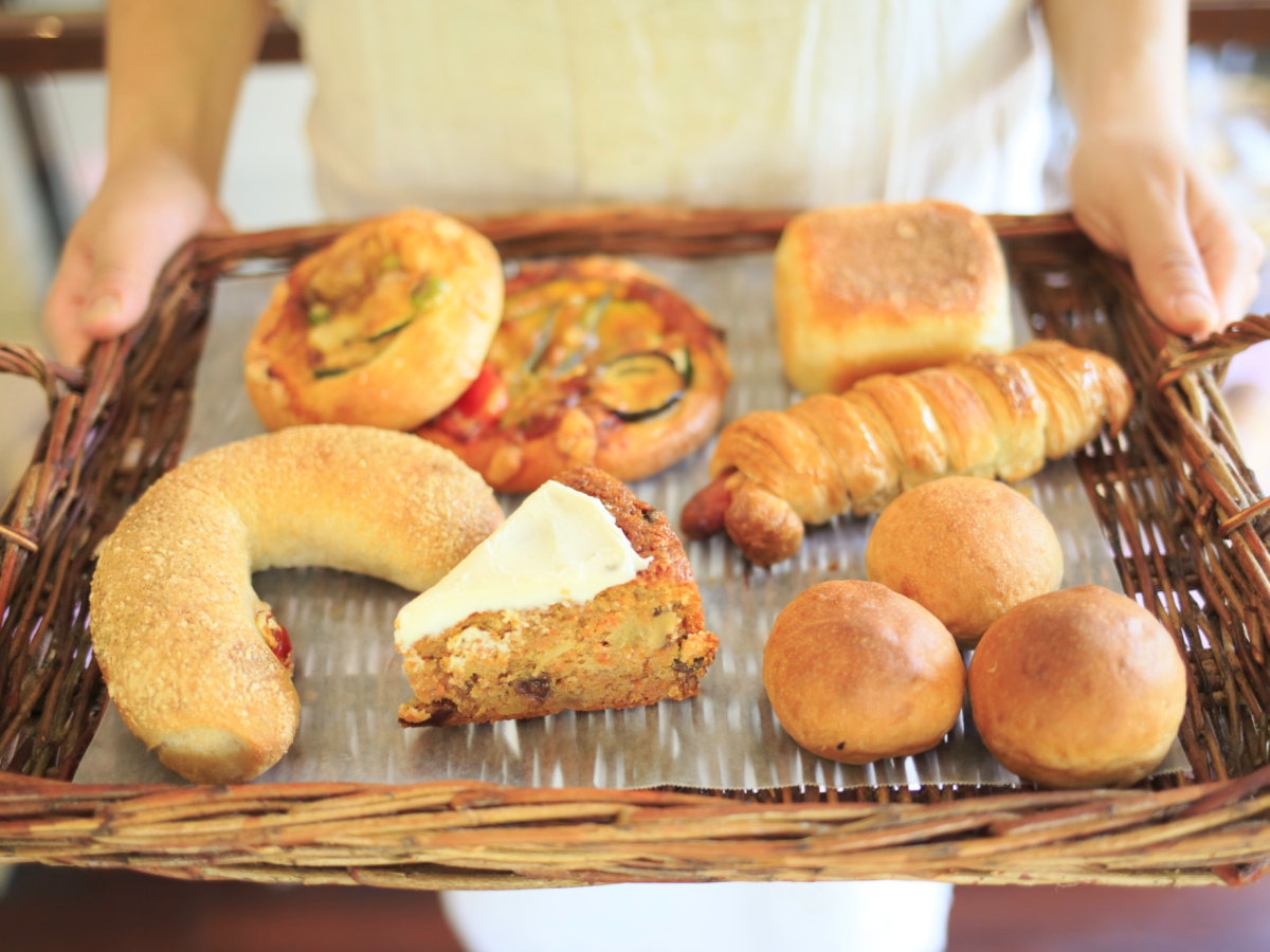 お腹がすいたら、川平湾からほど近い住宅地の中にあるかわいい隠れ家ベーカリーへ。島ならではの食材を使ったパンが待っています。「ベーカリー ピナコラーダ」には、島野菜や島豆腐、パイナップルといった島素材を取り入れたオリジナルのパンが日替わりで約25種登場します。正午前後が最も品揃え豊富なので、ねらい目です。