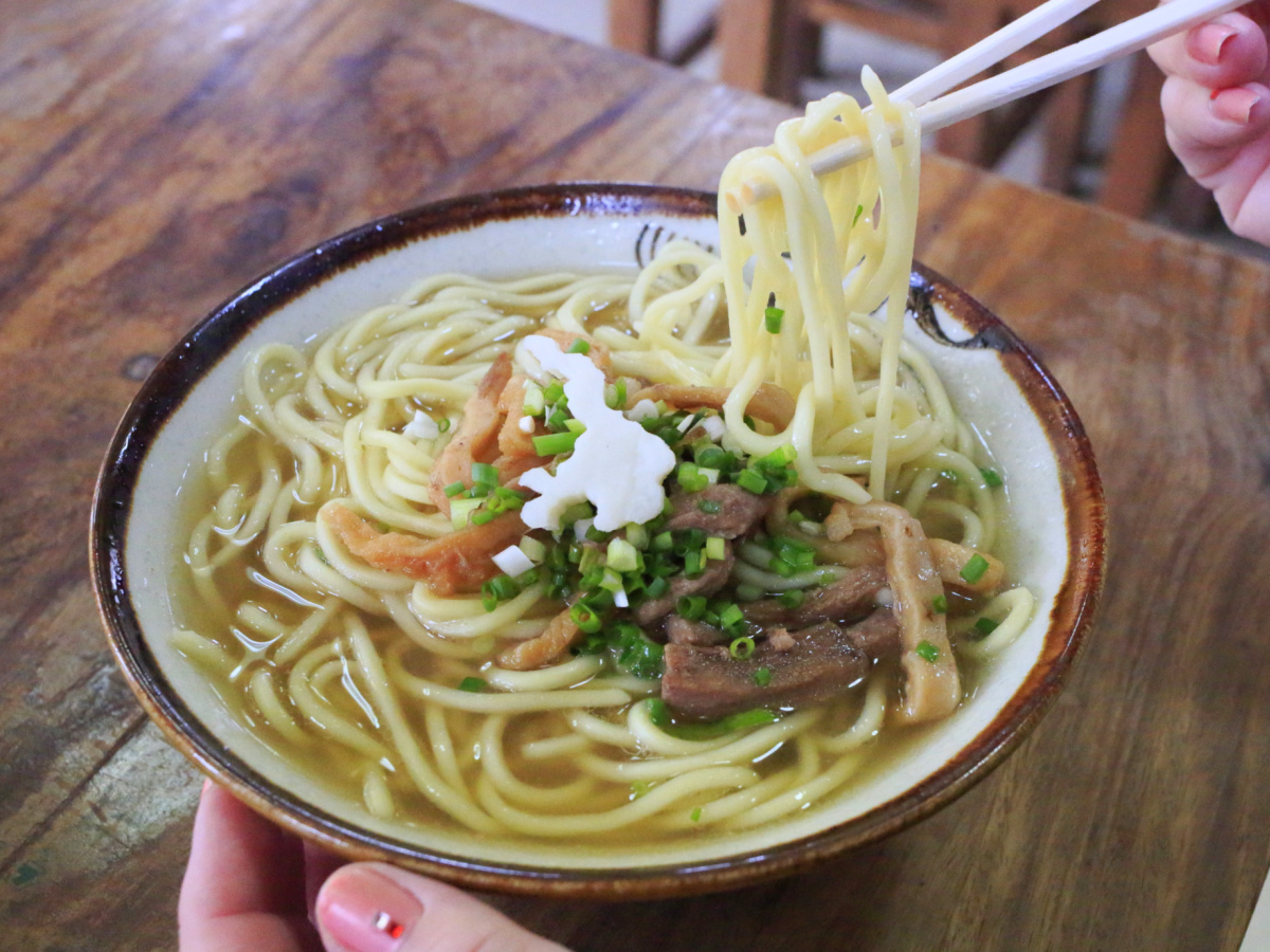 写真の「八重山そば」600円は、可愛い石垣島型のかまぼこいり!ほかにも、「ゴーヤちゃんぷる」や、青パパイヤを使う「パパイヤちゃんぷる」(季節限定)の定食各800 円、「沖縄風みそ汁定食」600 円などのメニューが揃います。