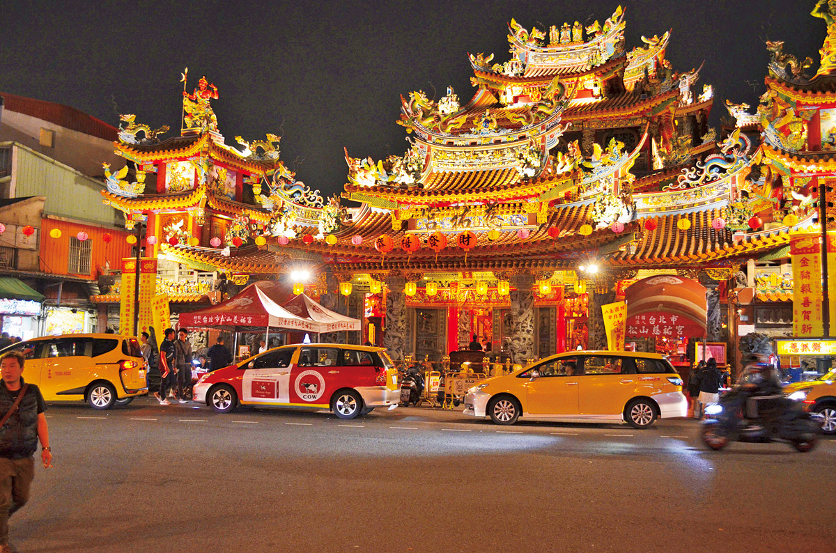 松山慈祐宮(ソンシャンツーヨウコン)は天上聖母「黒面媽祖」を祭るお寺。夜にはライトアップされ、幻想的な雰囲気に包まれています。