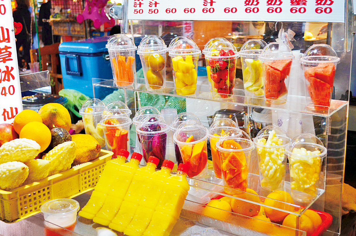 士林と違ってぼったくりの心配がない饒河街のカットフルーツNT$50~。レンブやシャカトウなど、台湾の果物にトライ!