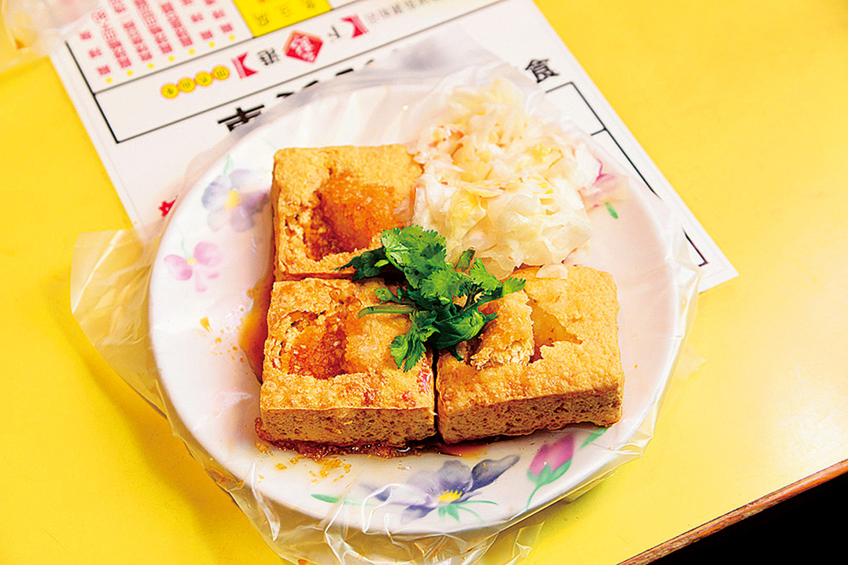 台湾版揚げ豆腐はNT$50。台北の名物ですが、独特のにおいが気になる人は、ほどよい酸味の漬物を合わせれば食べやすいそうなので要注意です。